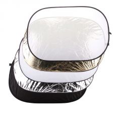 Öt az egyben (5 in 1) összecsukható derítőlap. Oldalai: - fehér - arany - ezüst - fekete és a közepe fehér diffuzor lap.