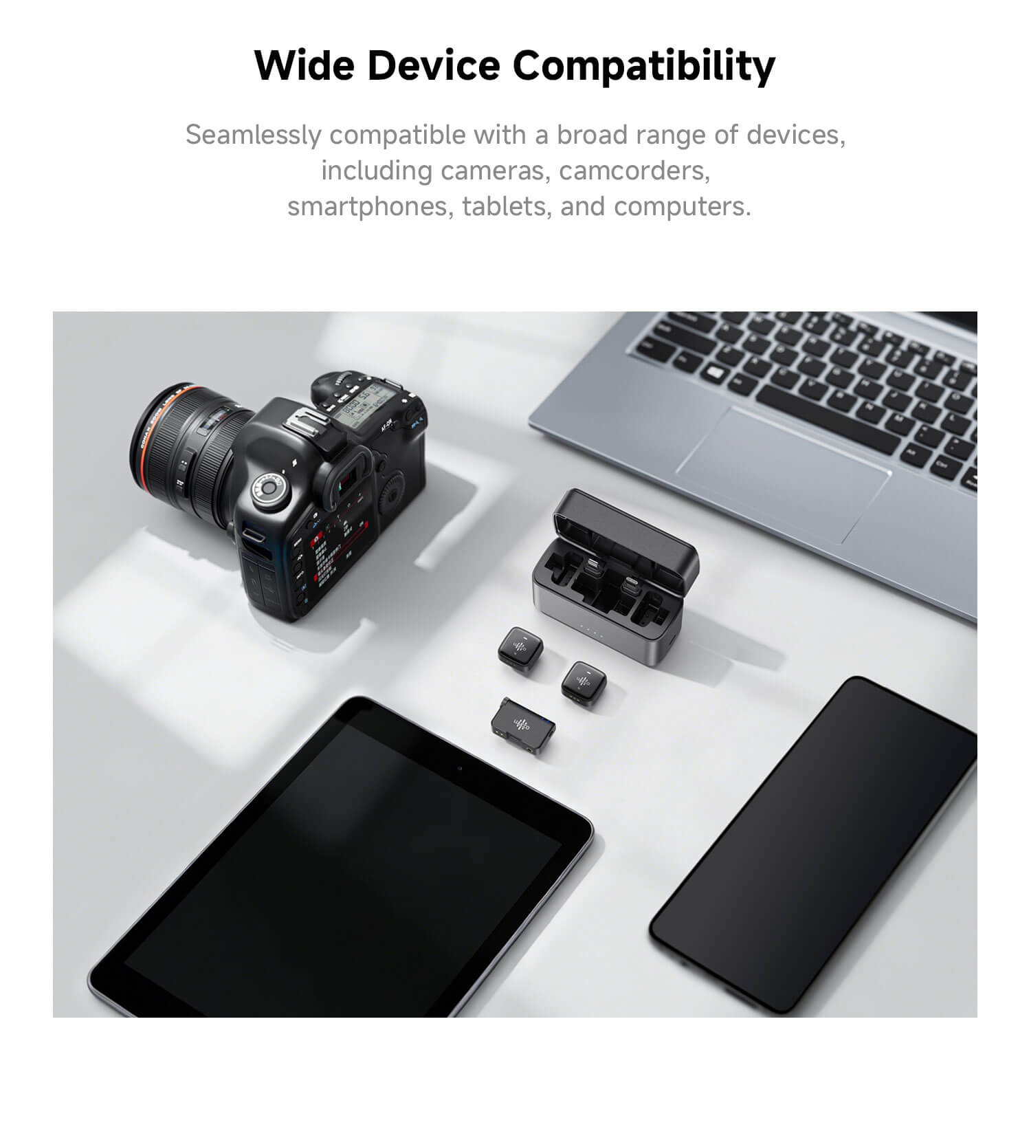 A LUUCCO AirMic kompatibilis fényképezőgépekkel, okostelefonokkal (USB‑C, Lightning adapterrel), számítógépekkel és más rögzítő eszközökkel. Ez hatékony, rugalmas megoldást nyújt videós tartalomkészítéshez, interjúkhoz, podcastokhoz és professzionális hangfelvételekhez.