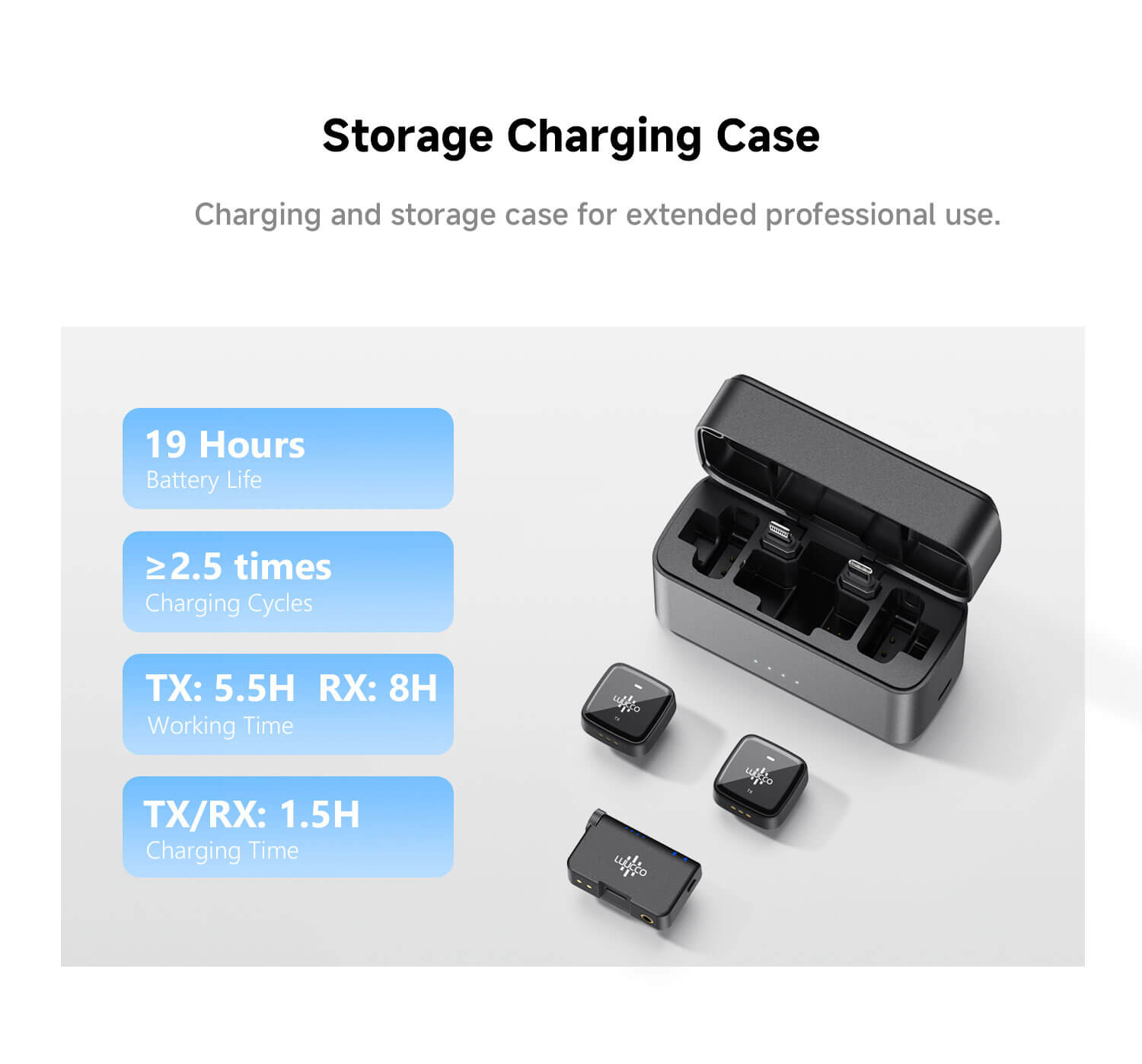 • Akár 6 óra üzemidő adónként, ~15 óra töltőtokkal